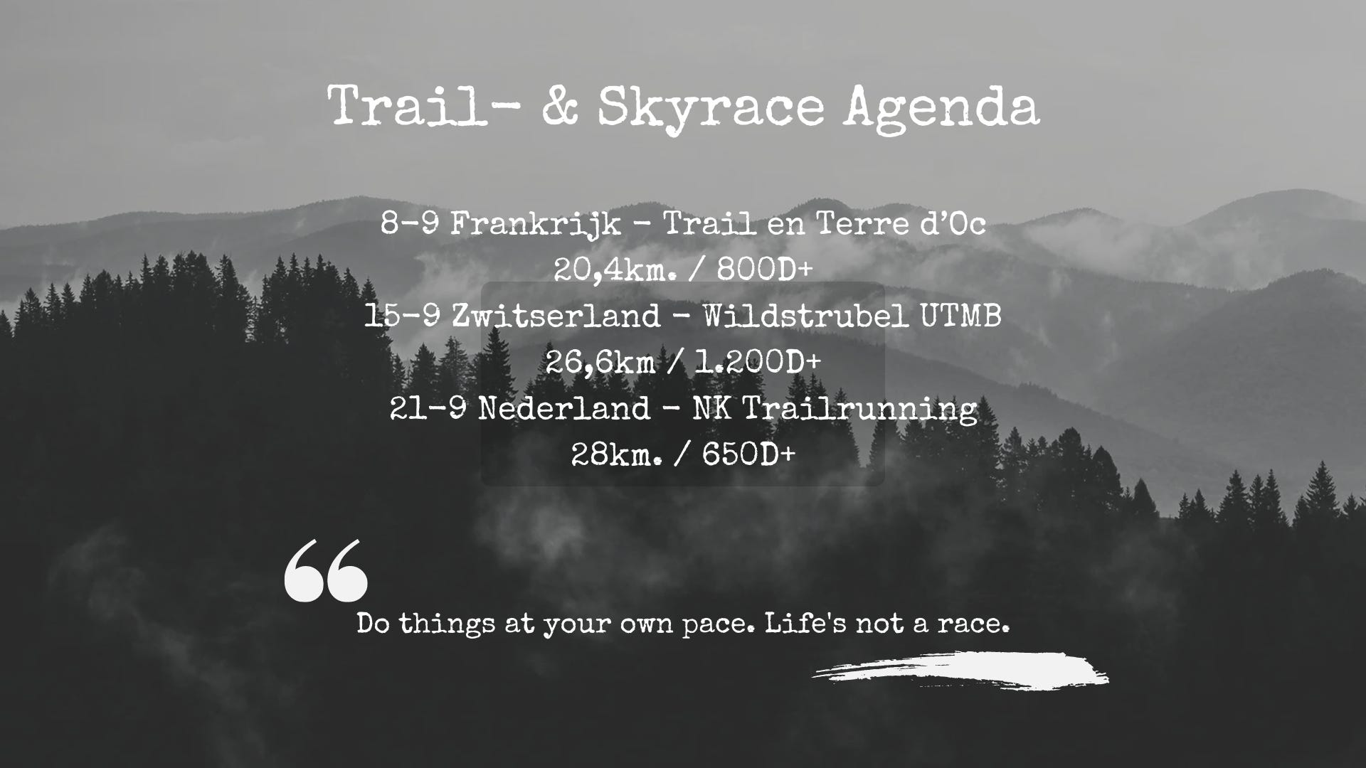 Zondag 1 september reis ik via een korte tussenstop in Luxemburg naar de steile kliffen van de Gorges du Tarn in Frankrijk, aansluitend naar Crans Montana in het alpine hooggebergte van Zwitserland, om vervolgens neer te dalen op het pittoreske en heuvelachtige Landgoed van Jurgens. Alwaar ik achtereenvolgens zal deelnemen aan drie trail- en skyraces, waarbij die laatste het Nederlands Kampioenschap Trailrunnen betreft.