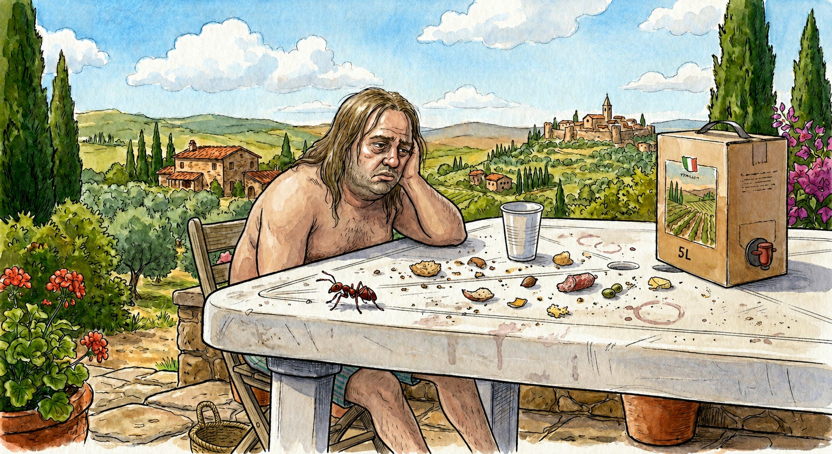 ‘Nog een wijntje?’ verzucht hij. Hij wacht mijn antwoord niet af, staat kreunend op en sleept zijn morbide obese lijf naar de hoek van het terras waar een goedkope vijfliterdoos zoete witte wijn staat te koken in de zon en hij schenkt een plastic bekertje tot de rand toe vol.