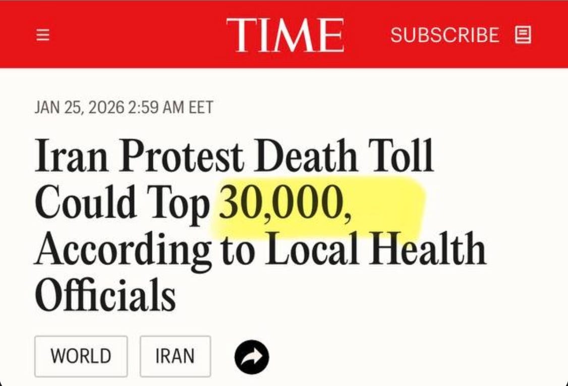 TIME Magazine: Naar schatting 30.000 mensen zouden alleen al op 8 en 9 januari op straat in Iran zijn omgekomen, zo vertelden twee hoge functionarissen van het Iraanse ministerie van Volksgezondheid aan TIME. Dit duidt op een dramatische stijging van het dodental. Zoveel mensen werden die donderdag en vrijdag door de Iraanse veiligheidsdiensten afgeslacht dat de capaciteit van de staat om de doden te verwerken ontoereikend werd. De voorraad lijkzakken was uitgeput, aldus de functionarissen, en ambulances werden vervangen door vrachtwagens met opleggers.